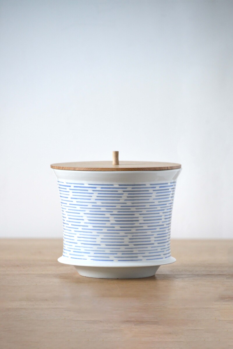 に映る陽の光を表現できないものかと日々製作しております。線刻染付の作