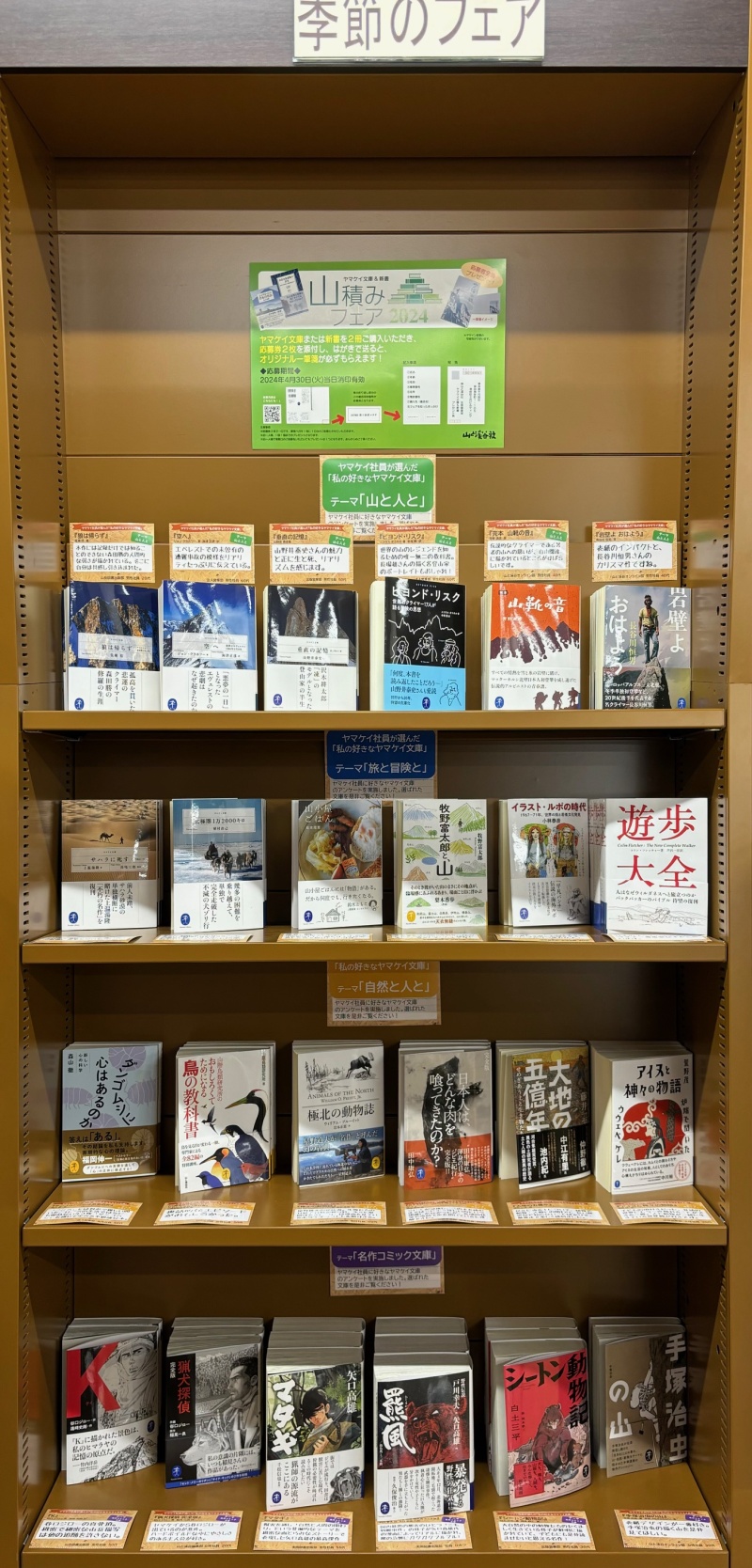 開催のたびにご好評をいただいております、ヤマケイ文庫&新書のフェアをただいま開催中です。今回の内容は、ヤマケイ社員が選んだ「私の好きなヤマケイ文庫」。テーマ「山と人と」です。山登り、山ごはん、犬ぞりレース、動物の生態など、好奇心を刺激されるタイトルや見て楽しい表紙にもご注目ください。実用書5:季節のフェア棚にて展開しております。