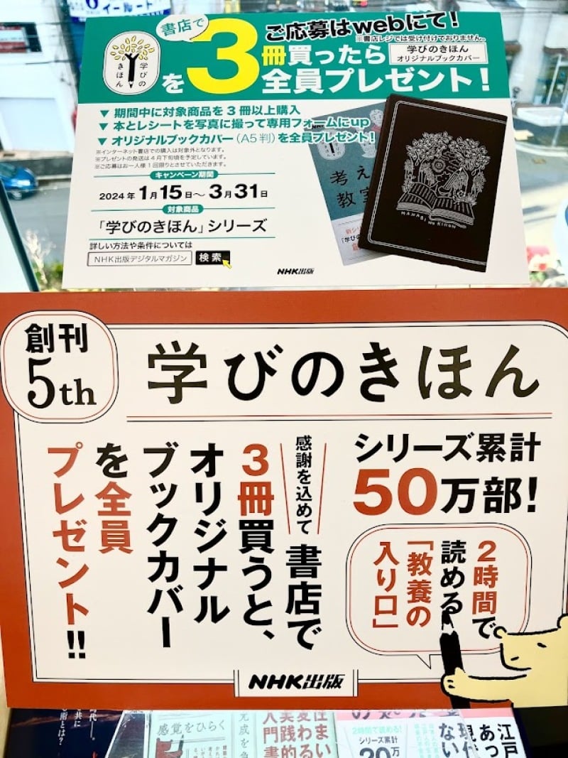 古今東西のあらゆる教養のきほんを1冊で学ぶことができる『学びのきほん』シリーズは創刊5周年、シリーズ累計50万部を突破しました。1冊1テーマで100ページ程度とコンパクトなので、気負わず読み進めることができます。対象商品を3冊以上ご購入いただき、「購入時のレシートと商品の写真」を応募フォームにアップされた方にブックカバーが貰えるキャンペーンも開催中です。ぜひ一度手に取ってみませんか。ご来店お待ちしております。