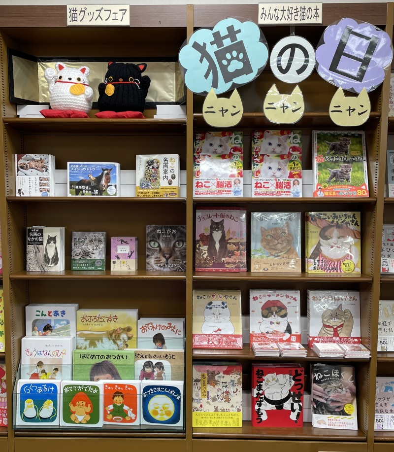 2月22日は「ニャン ニャン ニャン」の語呂に合わせた猫の日です。当店の「猫の日フェア」も今年で5回目となり、オススメの絵本やグッズ、写真集など盛りだくさん。かわいい猫、魅惑的な猫、おしゃれな猫。いろいろな猫の中からお気に入りの猫を見つけにきてくださいね。壁面話題書コーナーにてただいま開催中。今年も手づくりの招き猫がみなさまのお越しをお待ちしております。