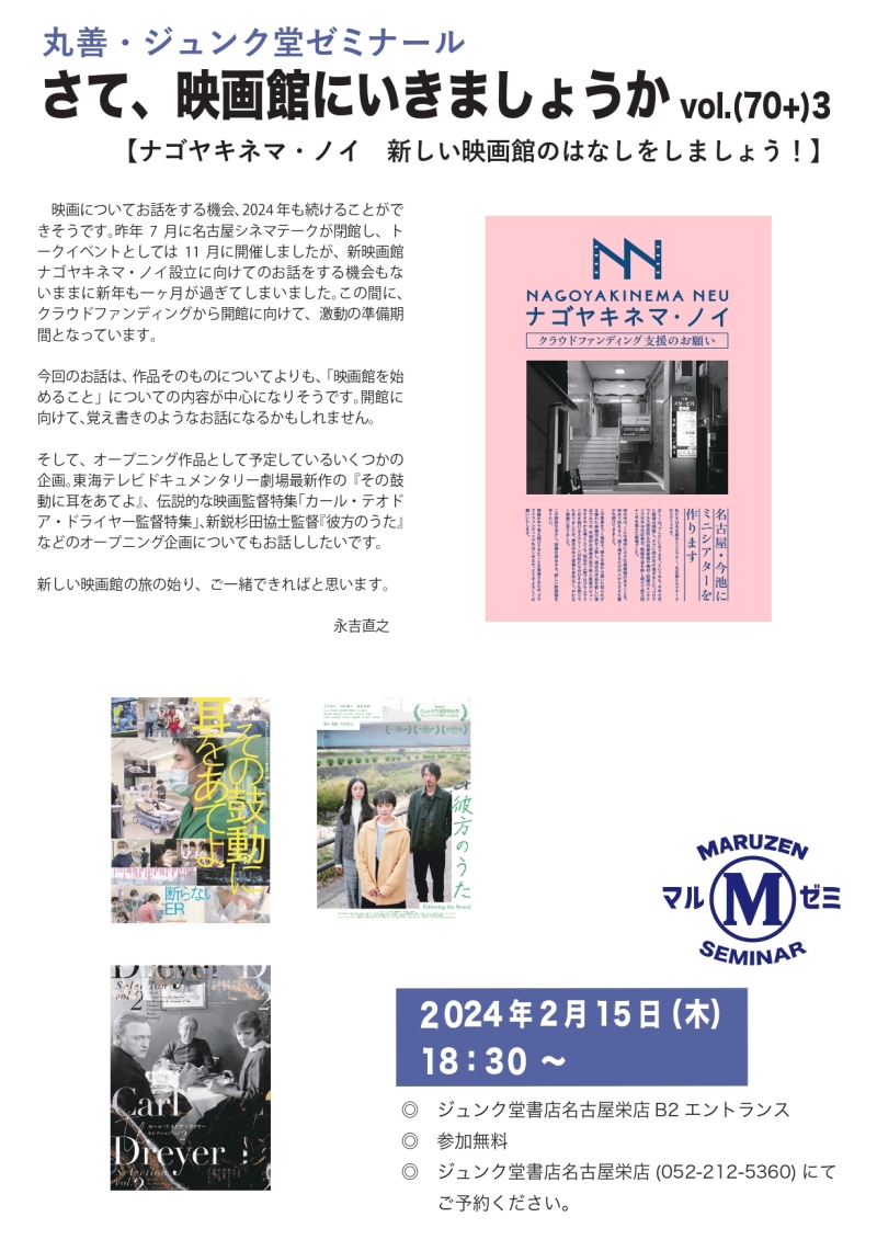 映画についてお話をする機会、2024年も続けることができそうです。昨年7月に名古屋シネマテークが閉館し、トークイベントとしては11月に開催しましたが、新映画館ナゴヤキネマ・ノイ設立に向けてのお話をする機会もないままに新年も一ヶ月が過ぎてしまいました。この間に、クラウドファンディングから開館に向けて、激動の準備期間となっています。