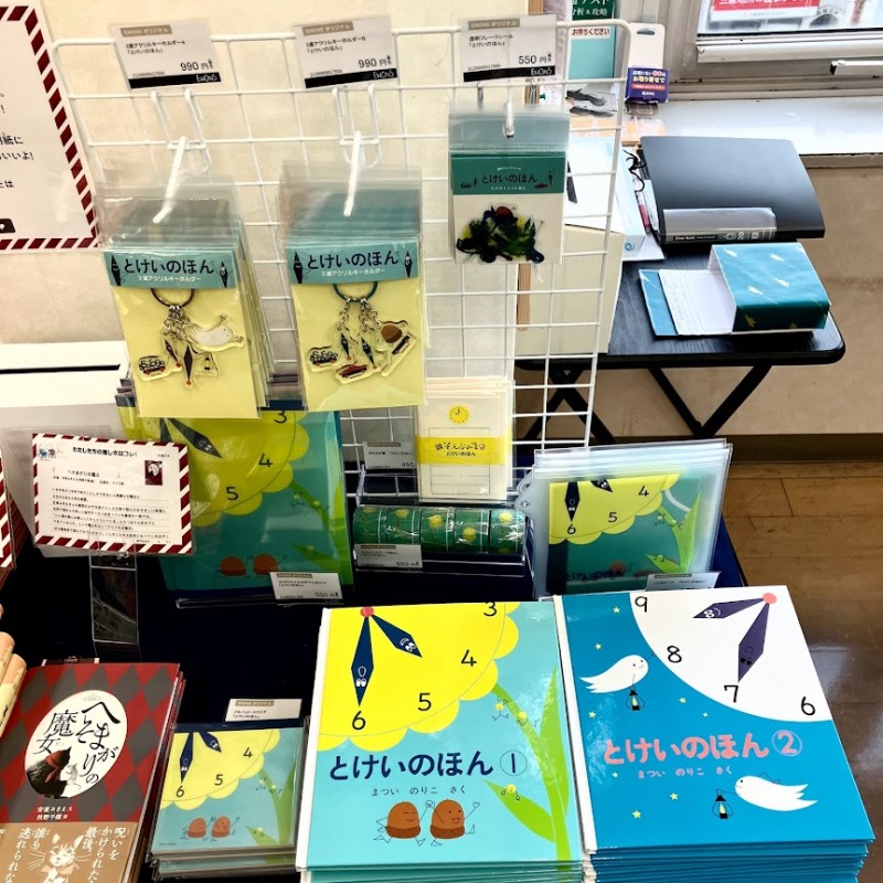 時計の針たちがやさしく時計の読み方を教えてくれる絵本『とけいのほん』の世界をより楽しめるグッズを販売中です。マスキングテープや3連アクリルキーホルダーなどの可愛いEHONSオリジナルグッズをご用意しております。お子様はもちろん、懐かしさを感じる大人へのプレゼントにもおすすめです。絵本と一緒に展開しておりますので、初見の方もぜひ『とけいのほん』の世界をお楽しみください。ご来店お待ちしております。