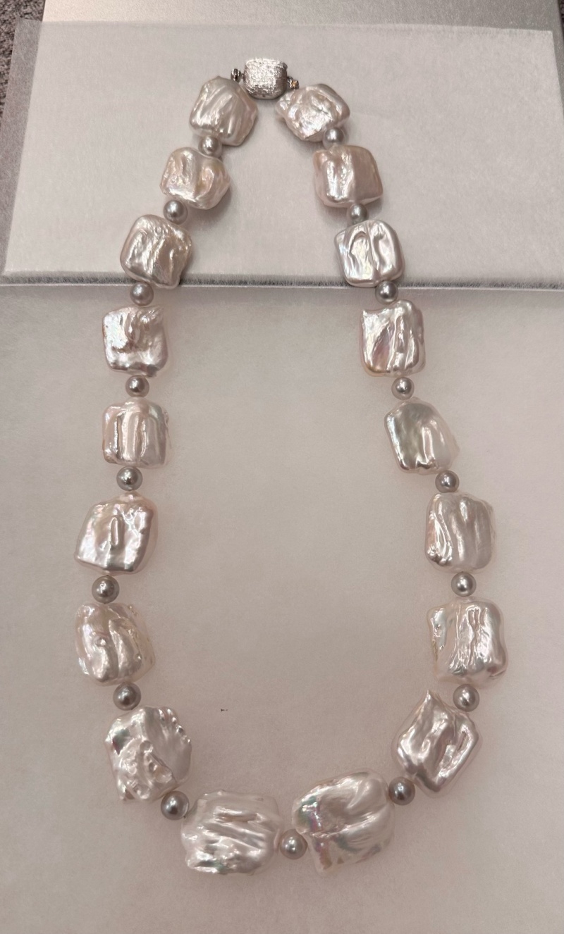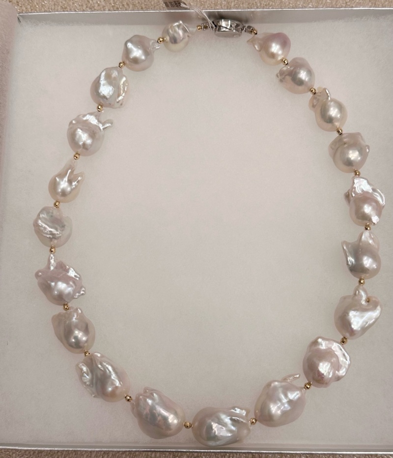 〈天然石工房 マリンスター〉美しい天然石と彫金の技術を用いてアクセサリーを創作するマリンスター。自分の感性で何処にもない魅力的な作品を創作し、オリジナルの創作アクセサリーを作っております。写真の商品は、照りと形の良い淡水バロック真珠です。身につけた時に安定感がある商品になっております。長さもございますので使い勝手がとても良い商品です。
