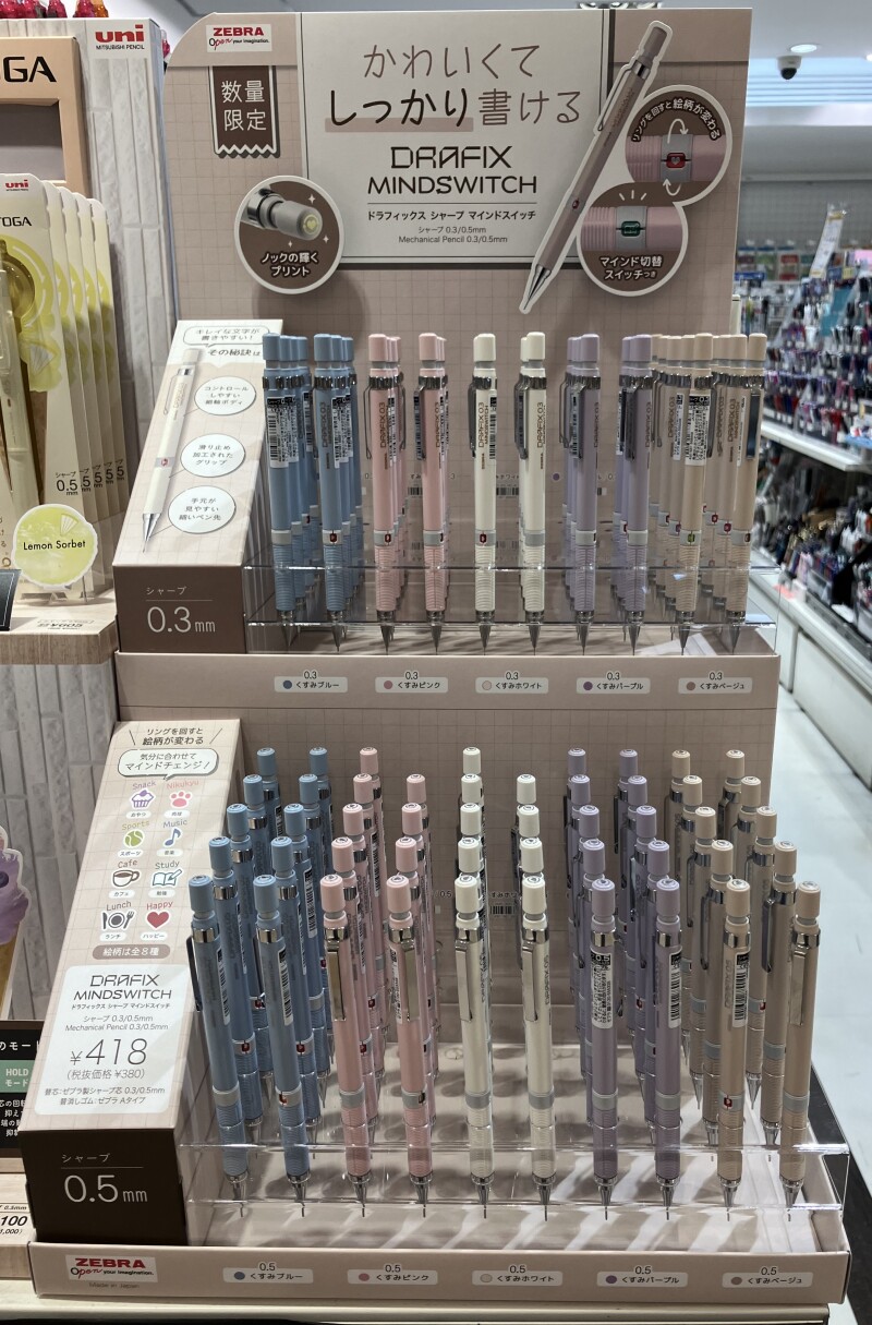 筆記具メーカーのゼブラより、ドラフィックスシャープ マインドスイッチというシャープペンが入荷いたしました!こちら、グリップ上のリングを回すと絵柄が変わるという、ちょっとした遊び心を加えた商品となっています。絵柄は全8種類、気分に合わせて絵柄を変えてマインドチェンジすることができます!軸色は温かみのあるくすみカラーです。細軸で、滑り止め加工されたグリップ仕様により、キレイな文字が書きやすいシャープペンになっています。数量限定のため、お早めに店頭にてご覧くださいませ!