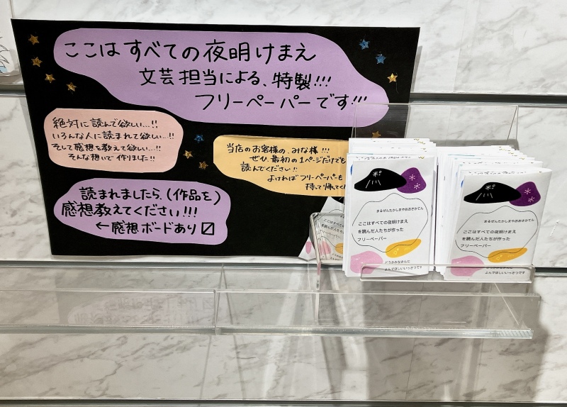 書籍の発売前に文芸書担当2人で読み合い、なんだこれは…。すごすぎる…。と大興奮した、第11回ハヤカワSFコンテスト特別賞受賞作『ここはすべての夜明けまえ』間宮改衣(著)が刊行されました。担当の感動をびっしり書き込んだ渾身のフリーペーパーを作成。とにかく作品を読んでほしい、そしてあなたの感想を教えてほしい、その強い気持ちをフェアとして展開しています。ぜひ当店で手にとってください。そしてフェアコーナーに設置している掲示板に感想を書きに来てください。裏表紙にあるように、「きっと読んだ人それぞれに違う感想を持つお話」そんな作品です。