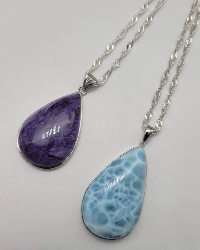 〈セブンスリー〉世界三大ヒーリングストーンのラリマー、チャロアイト、スギライトをはじめ高品質な天然石を数多く取り揃えております。中でもラリマーの魅力は何と言っても美しい模様にあります。白い雲が浮かぶ青空のような、太陽がきらめく南国の海のようなカリブ海の宝石ともいわれ、見るものを爽快な気分にさせる美しい天然石です。ネックレス、ブレスレット、リング、原石他ご用意しております。写真の商品は、ラリマーとチャロアイトのペンダントになります。これからの季節の装いに引き立つものになっております。