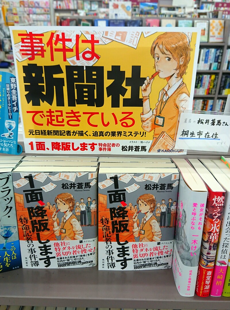 桐生市在住の作家、松井蒼馬さんのデビュー小説がKADOKAWAさんから発売されました。「社内の裏切り者を探せ!」作家の松井さんはなんと元新聞記者。そんな新聞社を舞台に主人公の女性が事件に挑みます。本書の社内の描写のリアルさと人間模様はきっとご経験が生かされているからかと!物語にリアリティがあり、事件の展開を読みながらぐっと引き込まれます。社内ミステリーの展開もハラハラします。桐生市在住の作家さんのデビュー作を是非!