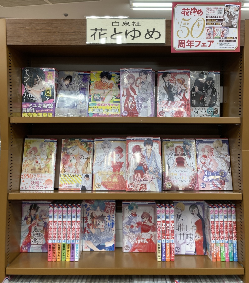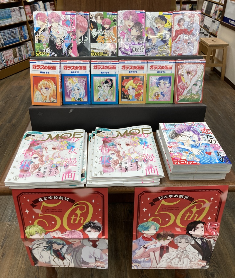 少女漫画界をけん引してきたコミック誌「花とゆめ」が今年、創刊から50周年を迎えました。それを記念するフェアを現在開催中です。「多聞くん今どっち!?」「墜落JKと廃人教師」など、今をときめく旬のタイトルと、歴史に名を刻む名作「ガラスの仮面」がコラボした特典カードがもらえる、特別なフェアとなっておりますので、ぜひこの機会に手に取ってみてはいかがでしょうか。