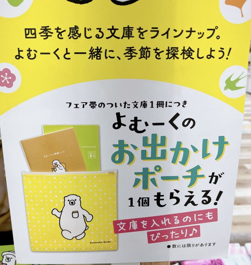 講談社文庫から春夏秋冬の四季を感じる本を集めた「よむーくの四季さんぽフェア」を開催中です。フェア帯のついた書籍をお買い上げの方に文庫本が入るよむーく柄ポーチを差し上げております。(お一人様お一つまで、なくなり次第終了となります。)