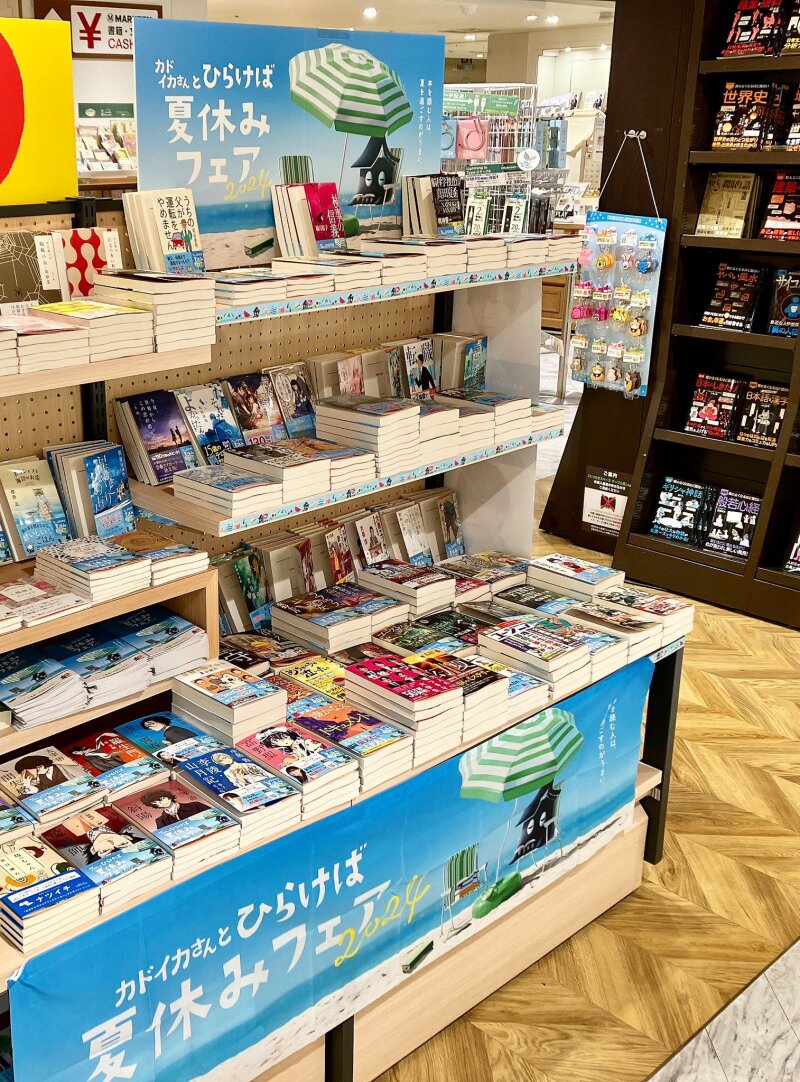 毎年恒例の夏の文庫フェアが揃いました!新潮社「新潮文庫の100冊」は対象商品1冊につき1枚「ステンドグラスしおり(全6種)」をプレゼント。新潮文庫のイメージキャラクター・キュンタくんのパネルが皆さんをお待ちしています。集英社「ナツイチ」は集英社文庫のキャラクター「よまにゃ」の「クリップブックマーカー(全4種)」 を対象商品1冊につき1点、レジにてプレゼント。万城目学さんの『偉大なる、しゅららぼん』はNoritakeさんのイラストの限定カバーです。KADOKAWAの夏のフェアの今年のテーマは「カドイカさんとひらけば夏休み」こちらは、大人気マスキングテープ「mt」とコラボレーションしたブックカバーや、KISHOWさん×角川文庫の初コラボ、8年目突入の文ストコラボカバーなど企画がもりだくさんです。