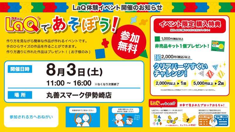 当店でもお子様から大人気のLaQですが、この度、体験イベント「LaQであそぼう!」を下記日程で開催します。