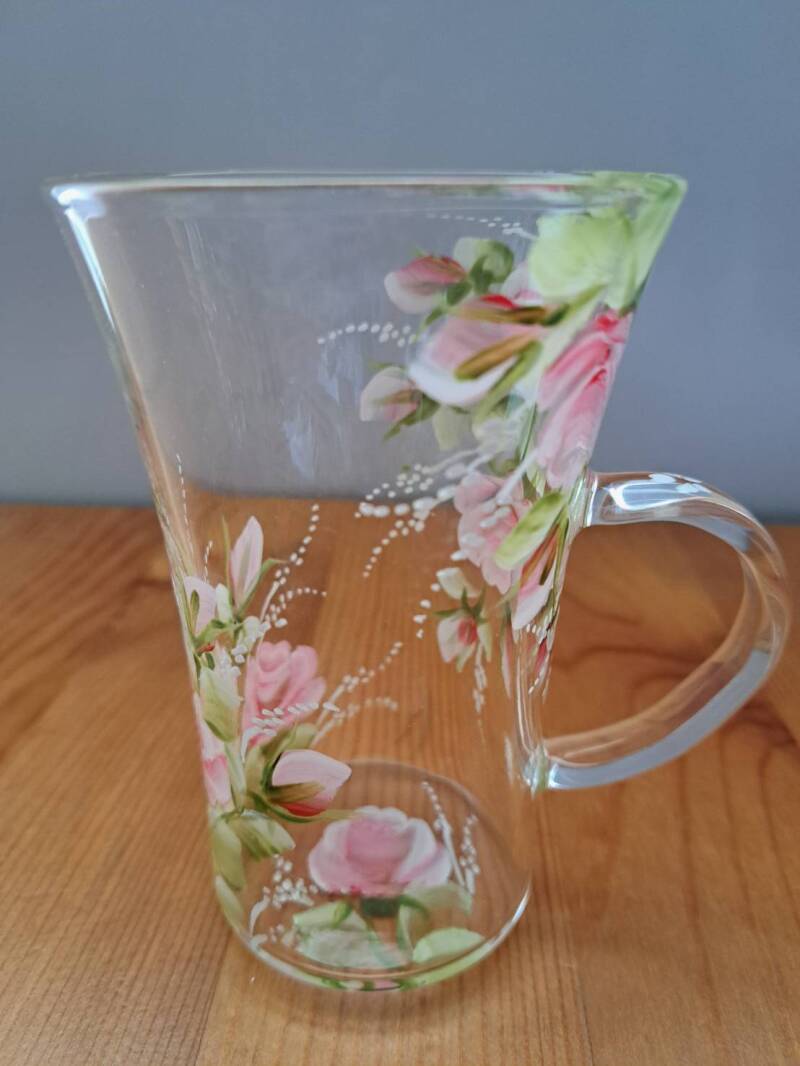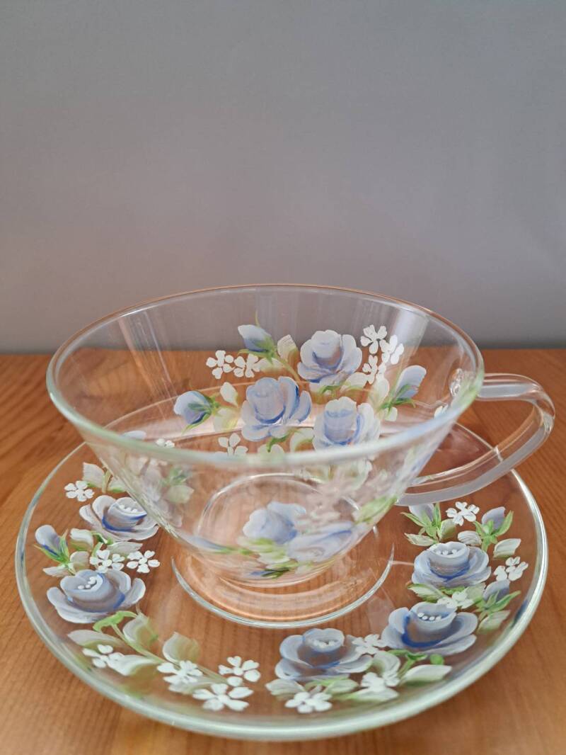 ガラス(グラス、ティーポット、カップ&ソーサー等)にアクリル絵の具の焼き付け用で手描きペイントをしてオーブンで焼き製作します。お手入れは他の食器同様にスポンジに洗剤をつけて洗ってください。焼き付けてありますので洗ってもペイントは落ちず、オリジナルで同じ作品はございません。写真の作品はハリオガラスの天然鉱物から作られている耐熱性に優れた耐熱ガラス素材で作られた作品になっております。