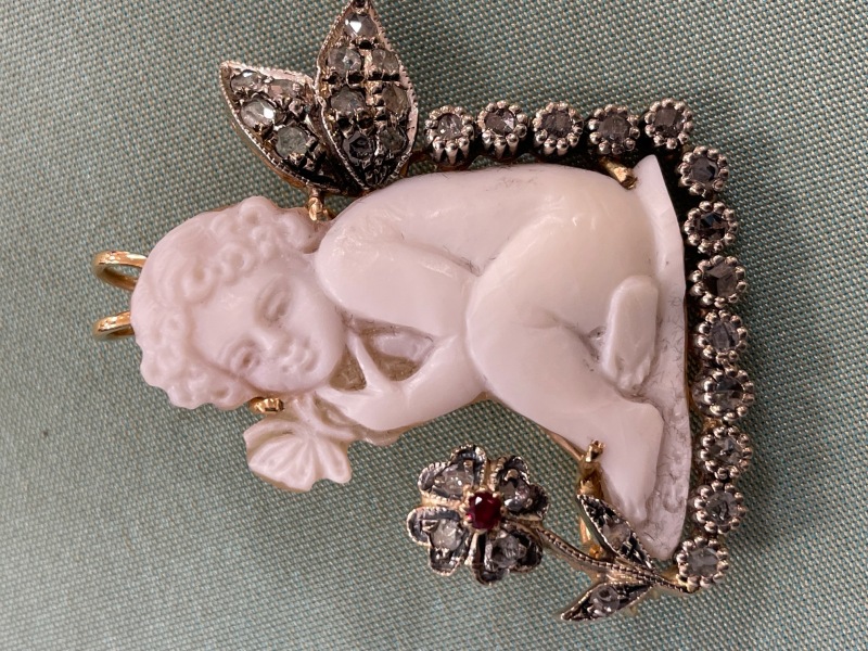 オリジナルキャストによる彫金ジュエリー。イタリア、ヴェネツィアの宝飾展示会に毎年出かけダイヤ、ルビー、サファイアその他の半貴石やパールを買いつけ、帰国後それらを使って指輪やネックレスイヤ、リングなどを制作しています。ダイヤ、ルビー、パールなどを組み合わせた繊細なデザインの1点ものです。1Fイベントスペース