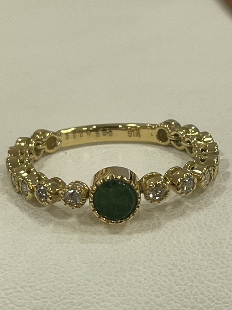 オリジナルキャストによる彫金ジュエリー。イタリア、ヴェネツィアの宝飾展示会に毎年出かけダイヤ、ルビー、サファイアその他の半貴石やパールを買いつけ、帰国後それらを使って指輪やネックレスイヤ、リングなどを制作しています。ダイヤ、ルビー、パールなどを組み合わせた繊細なデザインの1点ものです。1Fイベントスペース