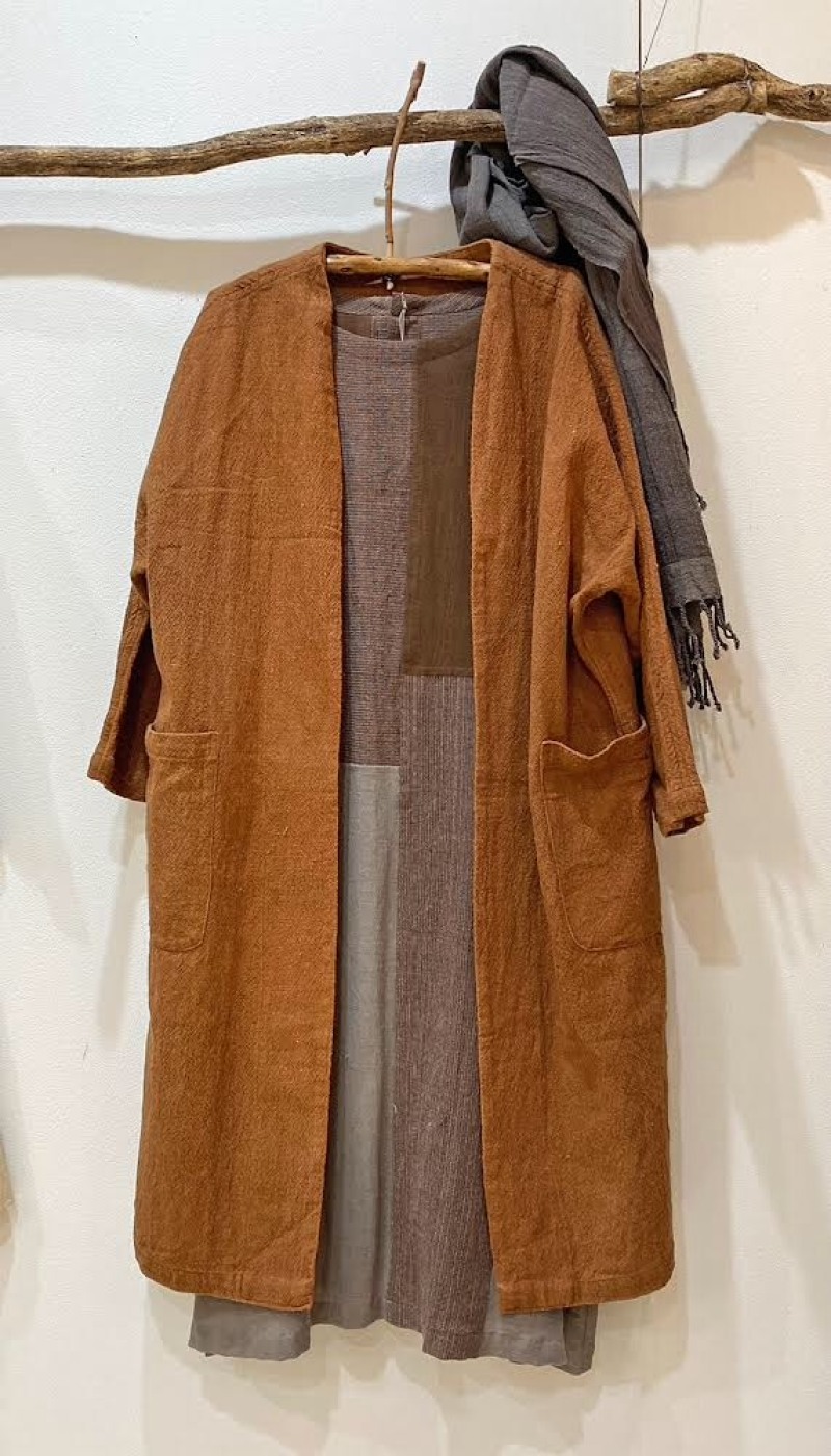 工房で織った手織り布を、インドの植物アンマロク、ハス、アセンヤク、ターラ、サラなどで染めたジャケット、コート、ワンピース、パンツが揃います。